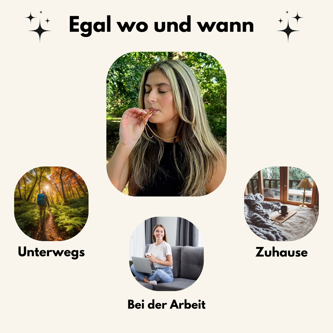 CalmPulse ist mehr als nur ein „Röhrchen“. Der optimierte Durchmesser und das einzigartige Design sorgen dafür, dass dein Ausatmen automatisch auf 6–8 Sekunden verlangsamt wird – genau der Bereich, der den Vagusnerv aktiviert. Ein einfaches Röhrchen bietet nicht denselben Atemwiderstand und somit nicht die gleiche Stress-reduzierende Wirkung.